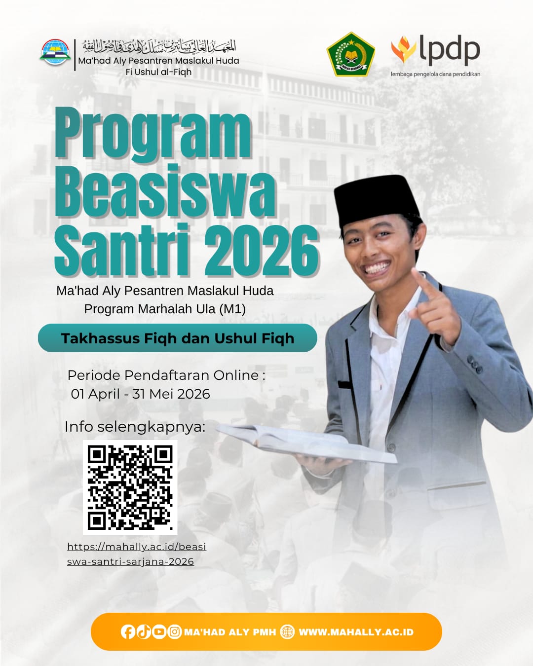 Pada tahun 2026 santri dapat mendaftarkan diri ke Ma’had Aly Pesantren Maslakul Huda fi Ushul al-Fiqh melalui program Beasiswa Santri Sarjana.