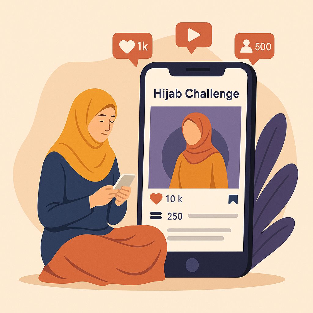Media sosial kini menjadi tempat ekspresi di mana kita bisa mencurahkan isi pikiran kita sesuai dengan pemikiran kita sendiri, tak jarang dari pemikiran menimbulkan pro dan kontra antara satu orang dan orang yang lain. Beberapa platform yang ada yaitu, tiktok, instagram, dan youtube. Akhir akhir ini kita sering menjumpai tren yang menjadikan viewers naik, like banyak, dan akun lebih dikenal banyak orang, yaitu Hijab Challenge. Dalam tren ini, seseorang yang menjadi konten kreator mengajak orang dan menampilkan transformasi penampilan, yang awalnya pakaiannya terbuka menjadi pakaian yang tertutup dan estetik. Perubahan ini dikemas melalui video yang diiringi musik, disertai visual yang menarik agar lebih banyak memikat perhatian orang. Tak jarang tren ini menjadi daya tarik dan hijab tidak hanya menjadi simbol ketaatan tetapi juga menjadi bagian dari ekspresi gaya hidup digital.