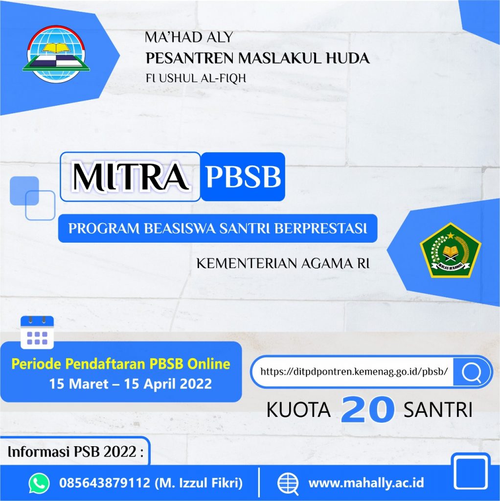 Pada tahun akademik 2022/2023 calon santri Ma’had Aly Pesantren Maslakul Huda fi Ushul al-Fiqh dapat mendaftarkan diri melalui Program Beasiswa Santri Berprestasi (PBSB).