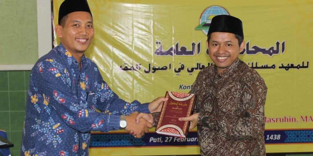 Acara ditutup dengan pemberian kitab kuningThoriqotul Husul A’la Ghoyah al-Wusuloleh Direktur Ma’had Aly KH Wahrodli kepada narasumber.