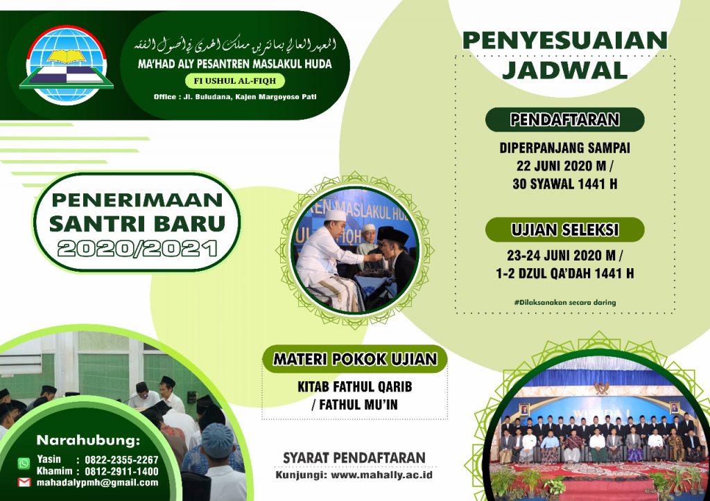 Melihat perkembangan situasi terkait Covid – 19, Penerimaan Santri Baru TA 2020/2021 Ma’had Aly Pesantren Maslakul Huda fi Ushul al-Fiqh disesuaikan jadwal pelaksanaannya, sebagai berikut: